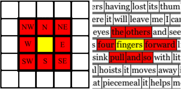 The layout of the traditional Moore neighborhood as generally employed in 'the game of life', contrasted with the typographic neighborhood for a textual grid. Note that neither 'eyes' or 'and' are included in the neighborhood due to their lack of vertical overlap (in this example) with the selected word below. The word 'others' is considered to occupy the NE neighbor position while the NW position is null.